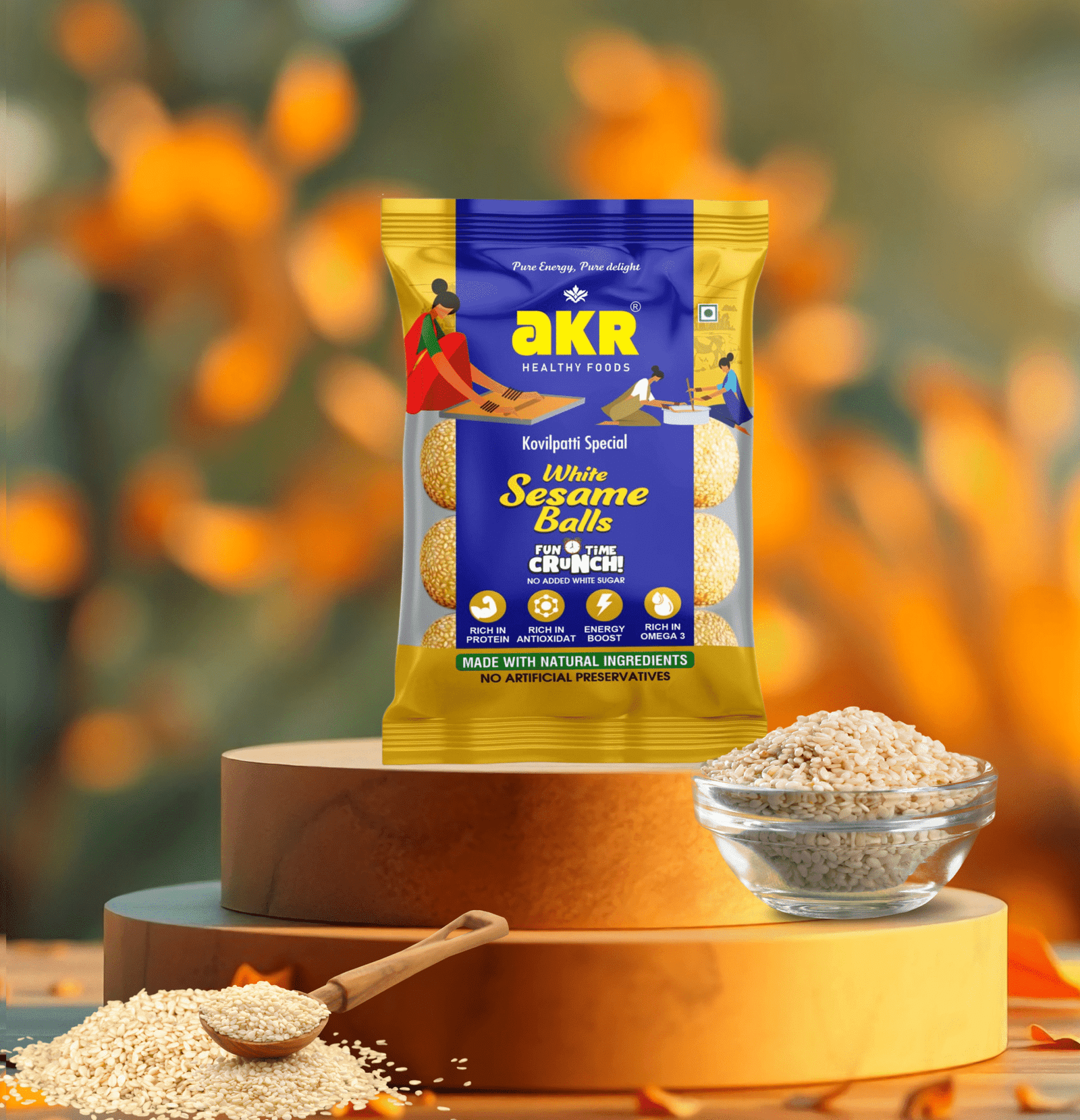 Experience the rich, nutty flavor and multiple health benefits of AKR HealthyFoods White Sesame Candy Balls. Made from premium roasted white sesame seeds combined with pure jaggery, these candy balls provide a natural source of calcium, magnesium, iron, and antioxidants that support strong bones, improved digestion, and radiant skin. Each pack contains 3 candy balls weighing 150g each, making them an ideal wholesome snack for anytime indulgence. Free from artificial additives, these traditional treats offer a delicious way to boost overall wellness.