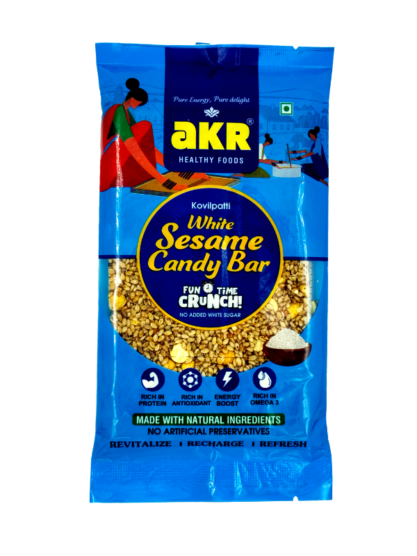 Discover the taste of tradition in every crunchy bite. The AKR Healthy Foods White Sesame Candy Bar is not just a snack — it’s a celebration of Kovilpatti’s legendary sesame candy heritage, now available in a convenient, hygienic, modern pack. Whether you’re a fitness enthusiast, a busy professional, a student, or a parent looking for a healthy alternative to chocolate bars and processed snacks, this sesame bar is crafted just for you.